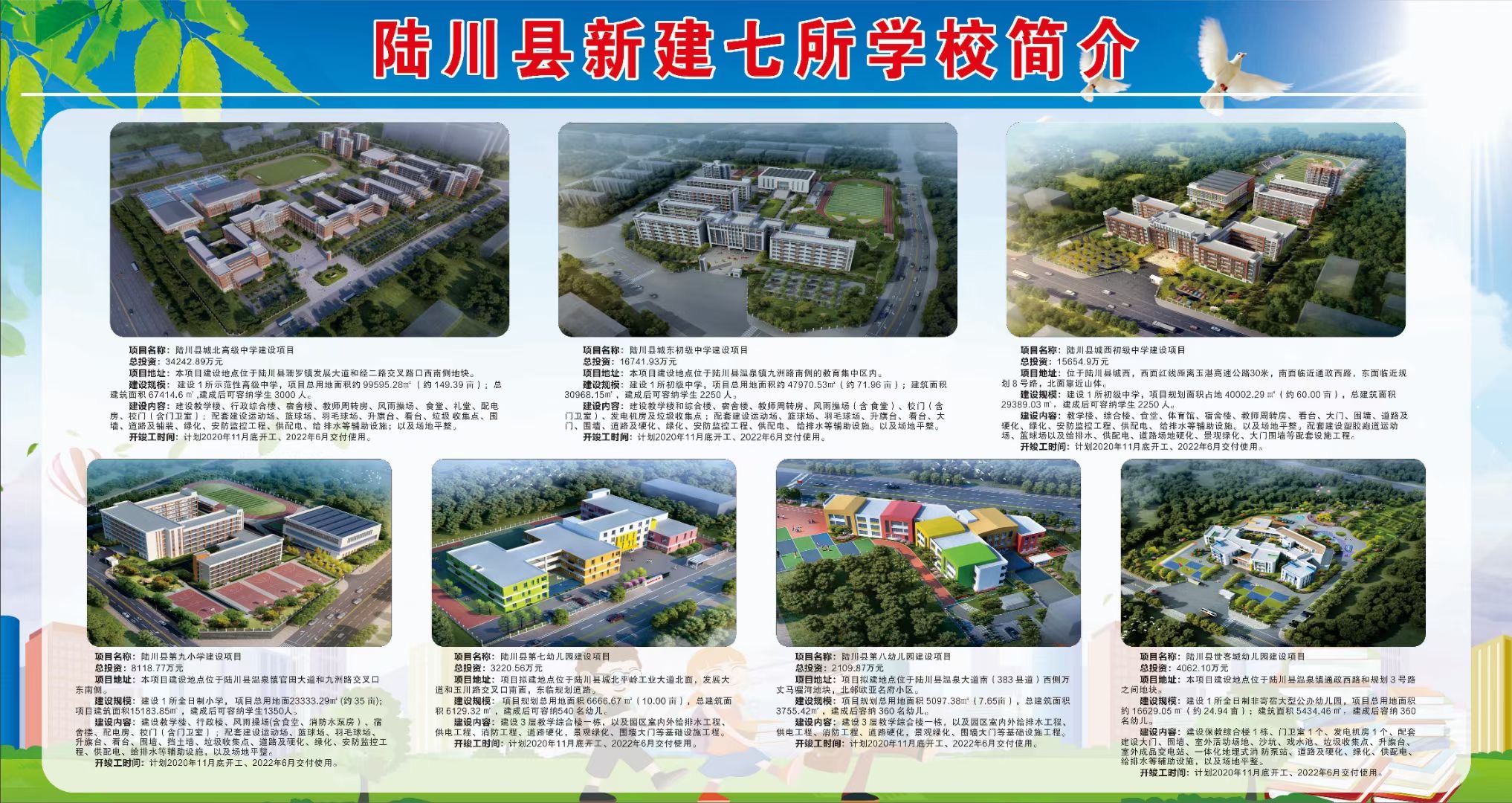 据悉,陆川县新建七所学校项目包括七个子项目,即新建1所高中、2所初中、1所小学和3所幼儿园(包括陆川县城北高级中学、陆川县城东初级中学、陆川县城西初级中学、陆川县第九小学、陆川县第七幼儿园、陆川县第八幼儿园、陆川县世客城幼儿园),总建筑面积约15.87万㎡,项目估算总投资约8.42亿元,工期为730天。