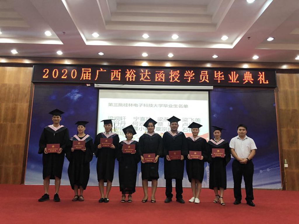 7月31日下午15:00,裕达函授班2020届函授学员毕业典礼在来宾裕达集团7楼大会议室举行。裕达集团行政人力总监陈妍妮、裕达集团人力资源部经理曾雪菊、广西人才市场学习中心部长助理黄淑文、教学主管姚再任老师、毛璐璐老师以及30余名毕业学员代表共同出席了此次毕业典礼仪式。