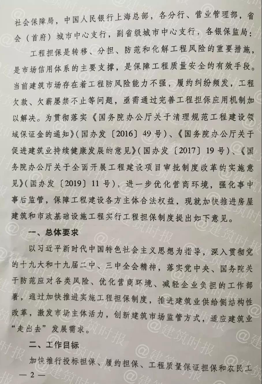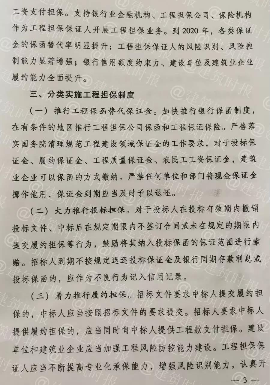 为贯彻落实《国务院办公厅关于清理规范工程建设领域保证金的通知》(国办发〔201649号)、《国务院办公厅关于促进建筑业持续健康发展的意见》(国办发〔201719号)、《国务院办公厅关于全面开展工程建设项目审批制度改革的实施意见》(国办发〔201911号),进一步优化营商环境,强化事中事后监管,保障工程建设各方主体合法权益,文件要求分类实施工程担保制度,促进工程担保市场健康发展。具体要求如下: