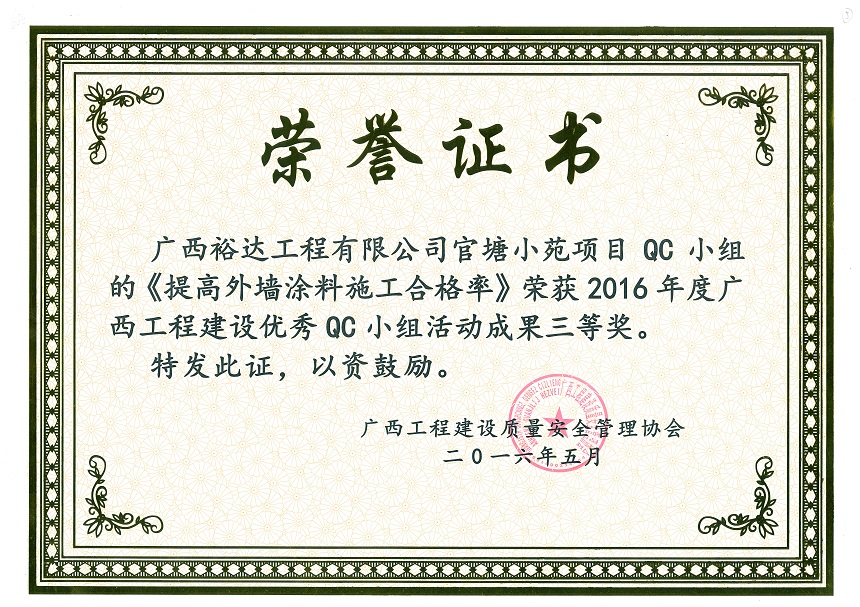 2016年度广西工程建设优秀QC小组活动成果三等奖《提高外墙涂料施工合格率》-官塘小苑项目